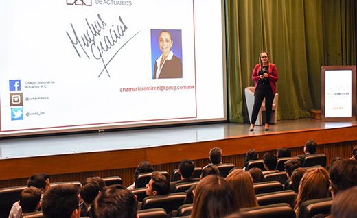 La primera ponencia del XXXI Congreso Nacional de Actuaría de la UDLAP, inició con la ponencia “Soy actuaria: mi visión de la actuaría”, a cargo de la Dra. Ana María Ramírez Lozano, presidenta del Colegio Nacional de Actuarios, quien en su plática habló sobre su experiencia en esta área y destacó el reto actual de un actuario: la comunicación. “El actuario es tan técnico que no puede expresar o transmitir adecuadamente con palabras lo que hace; es decir, no puede transmitir cualitativamente sus actividades permitiendo con esto que otros profesionistas desempeñen sus actividades”.
