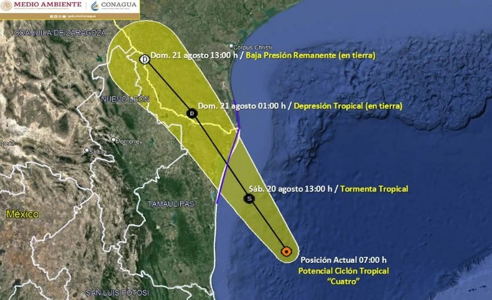 Para este sábado 20 de agosto, el potencial ciclón tropical “Cuatro” (o posible tormenta tropical) en el Golfo de México, se dirigirá hacia las costas de Tamaulipas y se prevé que ingrese a tierra durante la tarde o noche.