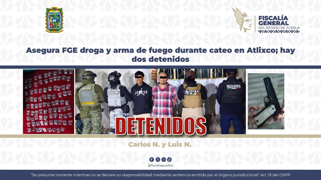 En una acción operativa conjunta, derivada de trabajos de investigación, la Fiscalía General del Estado de Puebla (FGE) ejecutó una orden de cateo en el municipio de Atlixco que permitió la detención de dos hombres y el aseguramiento de droga y un arma de fuego.