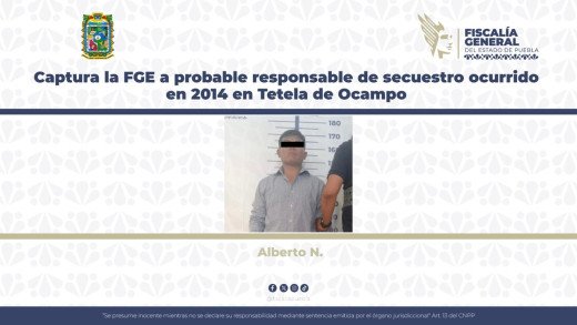 La Fiscalía General del Estado de Puebla aprehendió a Alberto N., de 28 años de edad, identificado como probable responsable del delito de secuestro, ocurrido el 30 de julio de 2014, en el municipio de Tetela de Ocampo.