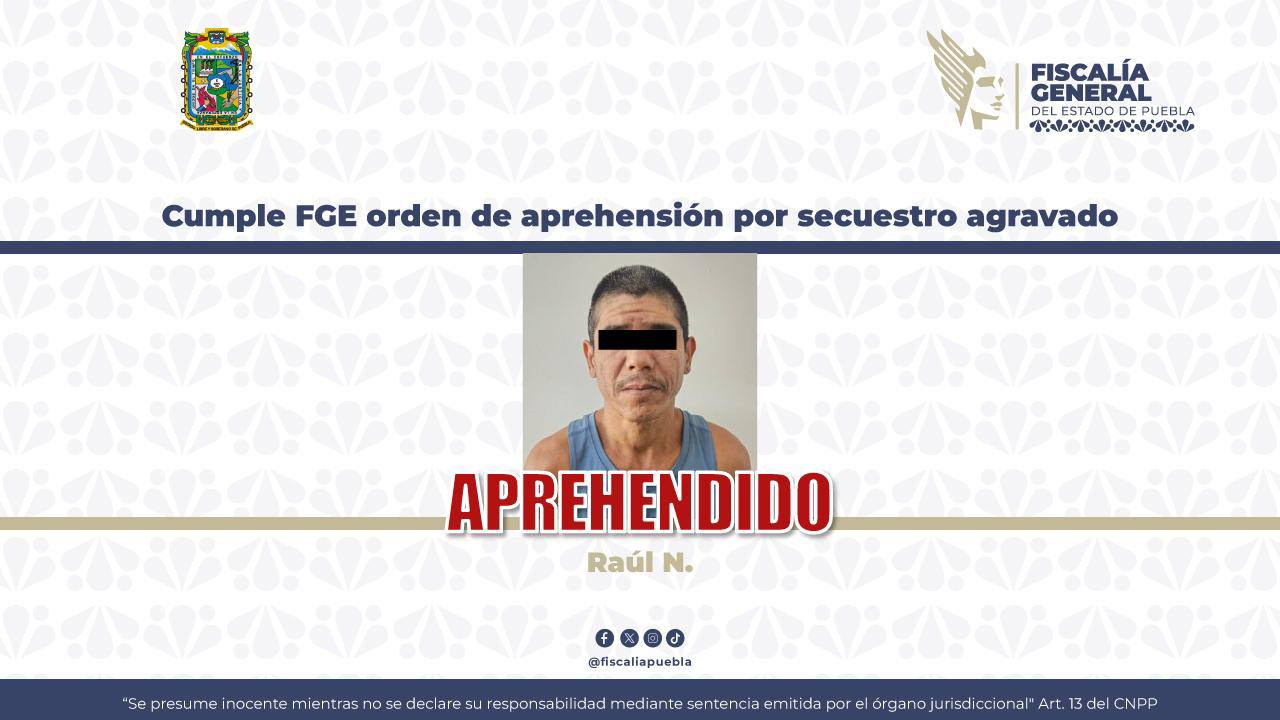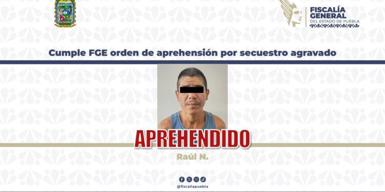 CIUDAD DE PUEBLA, Pue.- La Fiscalía General del Estado (FGE) cumplió una orden de aprehensión contra Raúl N. por el delito de privación ilegal de la libertad en su modalidad de secuestro agravado.