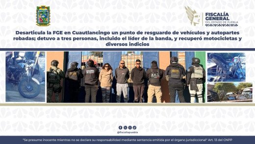 Como parte de las acciones contra el robo de vehículos, la Fiscalía General del Estado realizó un operativo interinstitucional de cateo en Cuautlancingo, Puebla, que derivó en el aseguramiento de un inmueble utilizado para el resguardo de unidades y autopartes de procedencia ilícita, la detención del presunto líder de la banda y dos cómplices, así como el aseguramiento de diversos indicios.