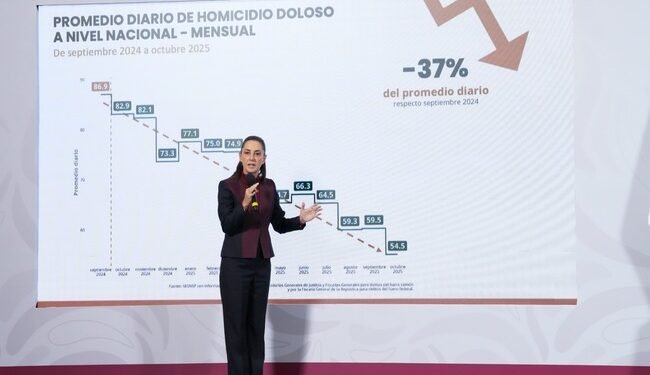 La Presidenta de México, Claudia Sheinbaum Pardo, resaltó la disminución de 37 por ciento en el promedio diario de homicidios dolosos, de septiembre de 2024 a octubre de 2025, al pasar de un promedio de 86.9 víctimas diarias a 54.5, respectivamente, es decir, hubo 32 homicidios dolosos menos diarios.