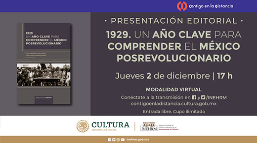 La Secretaría de Cultura del Gobierno de México, a través del Instituto Nacional de Estudios Históricos de las Revoluciones de México, invita a la presentación virtual de la novedad editorial colectiva: 1929: un año clave para entender al México posrevolucionario.