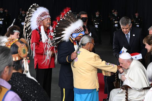 Francisco se sentó entre los dos funcionarios canadienses para una breve actuación de cuatro tamborileros y cantos nativos antes de que varios líderes indígenas, muchos de ellos con elaborados tocados, le saludaran e intercambiaran regalos.
