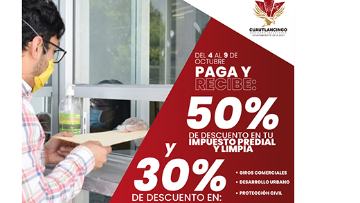 La Presidenta Municipal de Cuautlancingo, Lupita Daniel Hernández, dio a conocer que del lunes 4 al 9 de octubre, este Gobierno Incluyente aplicará el 50% de descuento en el pago de impuesto predial y limpia y el 30% de descuento en el pago de impuestos para Giros Comerciales, Desarrollo Urbanos y Protección Civil.