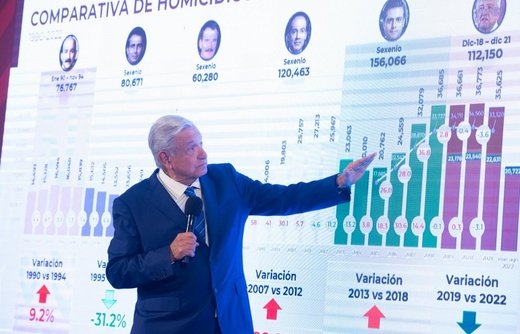 Ante representantes de los medios de comunicación explicó el análisis del promedio de homicidios dolosos por sexenio a partir de datos del Instituto Nacional de Estadística y Geografía (INEGI) y del Secretariado Ejecutivo del Sistema Nacional de Seguridad Pública de 1990 a agosto de 2022 resalta la disminución de 10.6 por ciento de variación total durante esta administración.