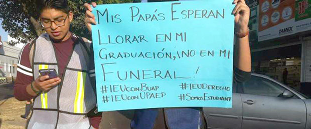 Los universitarios portaron cartulinas con leyendas como: “Mis papás esperan llorar en mi graduación y no en mi funeral”, “Quiero ver mi nombre en un titulo no en un ataúd”, “Un gobernador sin estudios nunca va a entender a los estudiantes”.