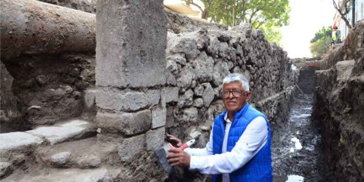 El coordinador del salvamento arqueológico, Juan Carlos Equihua Manrique, explica que las tareas de sustitución de drenaje han permitido bajar a 2.50 metros de la superficie y encontrar contextos arqueológicos más antiguos y sin perturbaciones, tal como sucedió con este muro colonial localizado en la inmediaciones del Centro Social y Deportivo Guelatao.