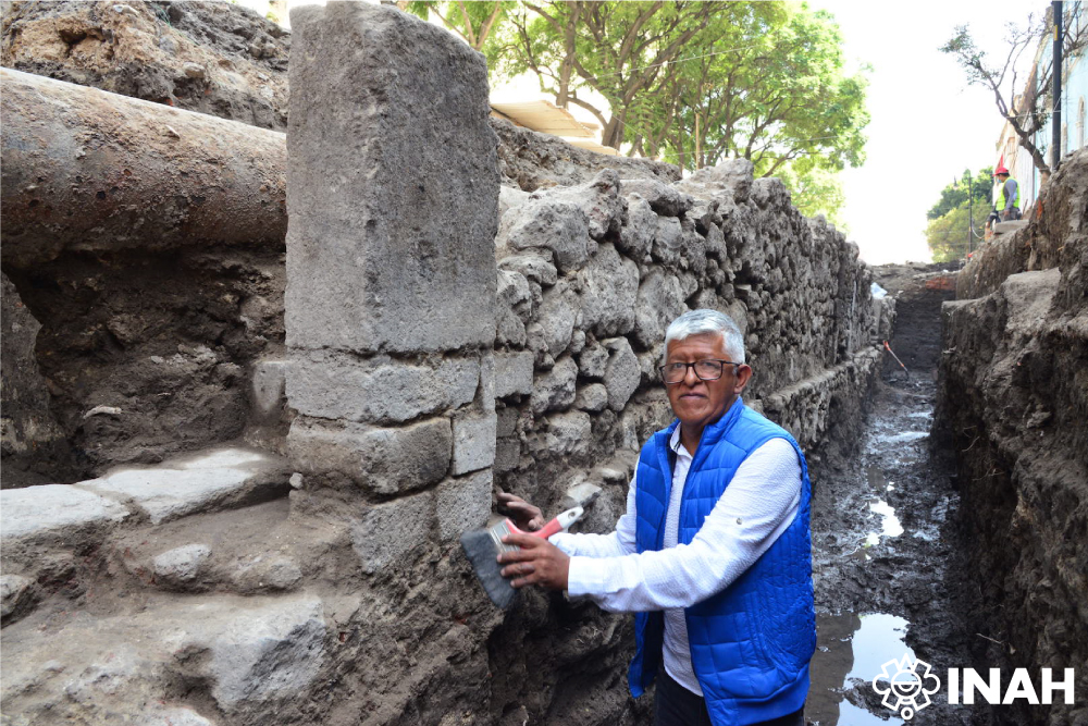“Tenemos remanentes del acabado del muro en el lado sur: un estuco de cal y arena, y también registramos restos del piso, porque esta pared debió contar con una buena cimentación debido a la inestabilidad del terreno. Recordemos que nos encontramos en una sección de la parcialidad Cuepopan, asentada en un suelo fangoso de México-Tenochtitlan, por eso –ya para la época colonial– sería nombrada: La Lagunilla”.