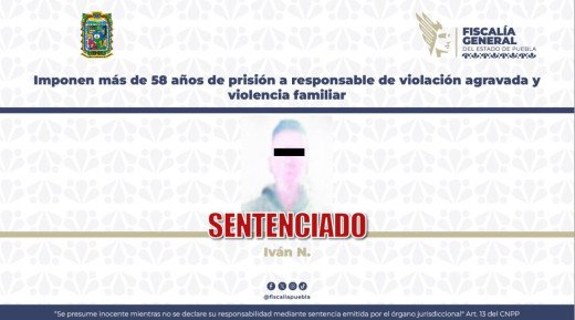 Como resultado de las pruebas presentadas por la Fiscalía General del Estado de Puebla (FGE), la autoridad judicial dictó sentencia condenatoria contra Iván N., de 25 años, por su responsabilidad en los delitos de violación agravada y violencia familiar, en agravio de una adolescente, hechos acontecidos en el municipio de Huejotzingo.