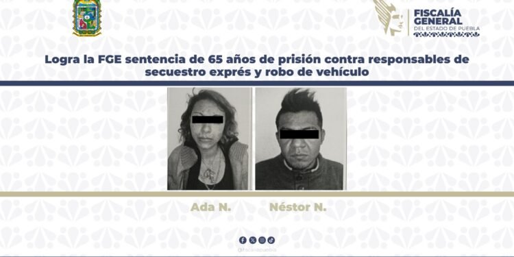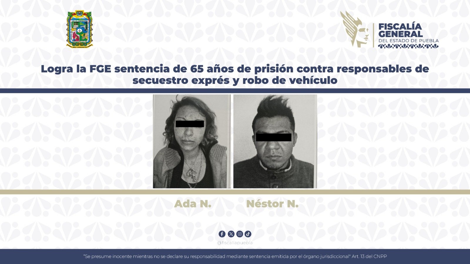 La Fiscalía General del Estado logró una sentencia de 65 años de prisión contra Ada Yadira N., y Néstor Joan N., penalmente responsables de los delitos de secuestro exprés agravado y robo de vehículo agravado, cometidos en octubre de 2018 en la colonia Lomas de Castillotla de la ciudad de Puebla.