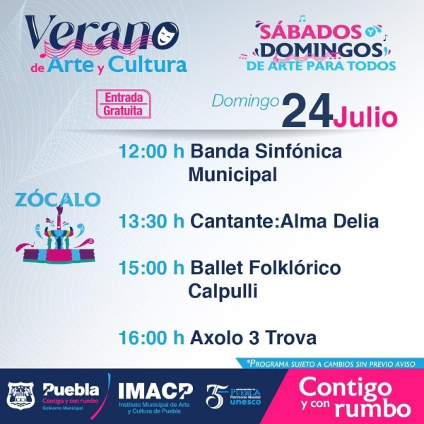 La danza, el canto y el arte son los encargados de darle vida al Centro Histórico este fin de semana, como parte de la agenda de “Verano de Arte y Cultura 2022” del Gobierno Municipal, las actividades nunca faltarán en los espacios públicos. Este sábado 23 de julio, las familias poblanas y visitantes podrán gozar de presentaciones como la de César Alejandro Olvera, intérprete de música acústica, que estará a las 14:00 horas o de la compañía de Danza Regional “Macuil-Xóchitl” a las 15:00 horas, ambas en el Zócalo de la ciudad. Pero las actividades culturales no se limitan a este espacio, en el Parque de San Luis habitantes y turistas también podrán disfrutar del talento de María Velher, a las 13:00 horas. El domingo 24 de julio, a las 12:00 horas, la Banda Sinfónica Municipal volverá a hacer del Zócalo un escenario al aire libre al que podrán llegar todas y todos para deleitarse con la mejor música. Seguido, se desarrollarán las presentaciones de Alma Delia, cantante de música versátil; la del Ballet Folklórico Calpulli; y la de Axolo 3 Trova. Al medio día, en el Teatro de la Ciudad, también estará el espectáculo Gala de Danza de New Ballet Studio y, se cerrará el telón con broche de oro a las 18:00 horas con el concierto de la Orquesta Filarmónica de Puebla. El programa completo de este fin de semana de Arte y Cultura se pueden consultar en las redes sociales del Ayuntamiento: @PueblaAyto en Twitter y @HAyuntamientoDePuebla en Facebook; así como en la página pueblacapital.gob.mx.