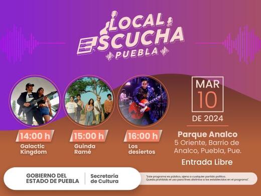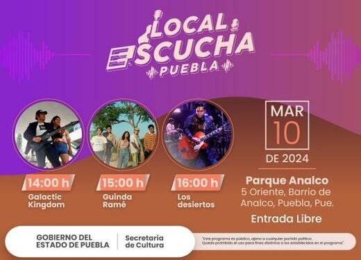 CIUDAD DE PUEBLA, Pue. – La Secretaría de Cultura informa que, los días 10 y 16 de marzo, tendrán lugar cinco conciertos de artistas y grupos poblanos, como parte del programa “Local, escucha Puebla”, los cuales podrán ser presenciados de forma gratuita.