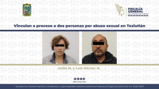 Como resultado de las acciones jurídicas, la Fiscalía General del Estado de Puebla (FGE) obtuvo la vinculación a proceso de Luis Héctor N. (50 años) y Anita N. (46 años), por su probable responsabilidad en el delito de abuso sexual, en agravio de una adolescente, hechos ocurridos en el municipio de Teziutlán.